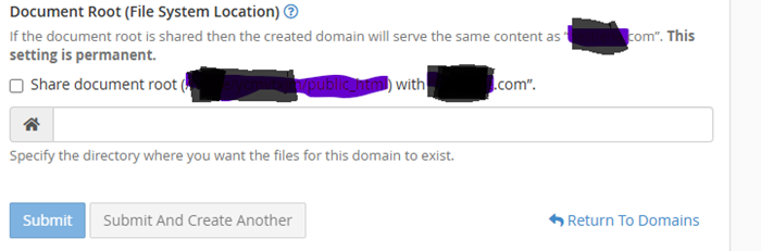 6. Do not share the document root. For the next step, if you have that option ticked, then untick it, so the subdomain and your main domain don’t share the same file.